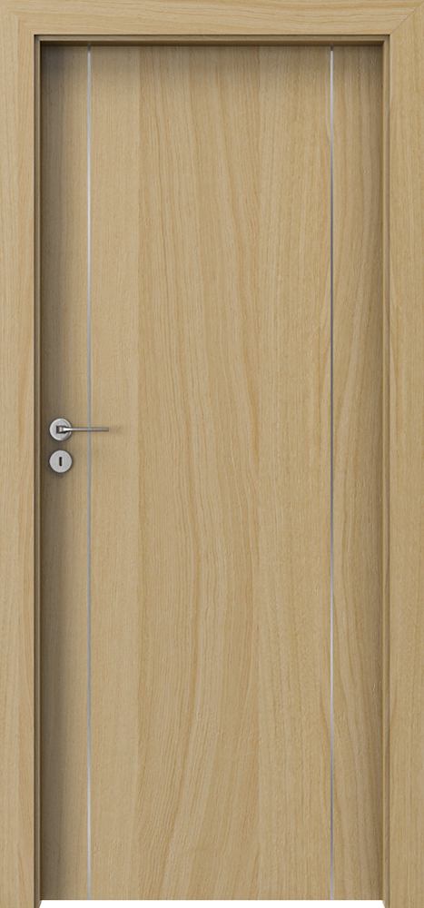 NATURE LINE е интериорна врата с естествен фурнир и характерни декоративни инкрустации с ширина 6 mm в сребрист, златист или черен цвят. Линеен акцент, който подчертава формата на крилото без да я претоварва.